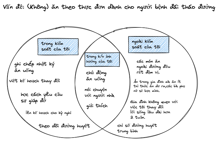 Dưới đây là ví dụ sơ đồ Venn mô tả vấn đề một khách hàng của tôi gặp phải khi họ muốn thay đổi lối sống để quản lý bệnh tiểu đường.