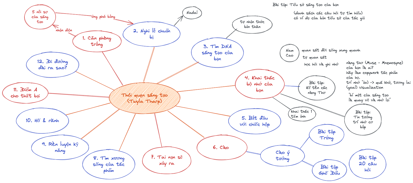 Dưới đây là ví dụ một sơ đồ tư duy đơn giản mà tôi viết cho cuốn sách Thói Quen Làm Nên Sáng Tạo của biên đạo múa Twyla Tharp sau khi đọc phiên bản ebook của nó trên ứng dụng sách nói Fonos.