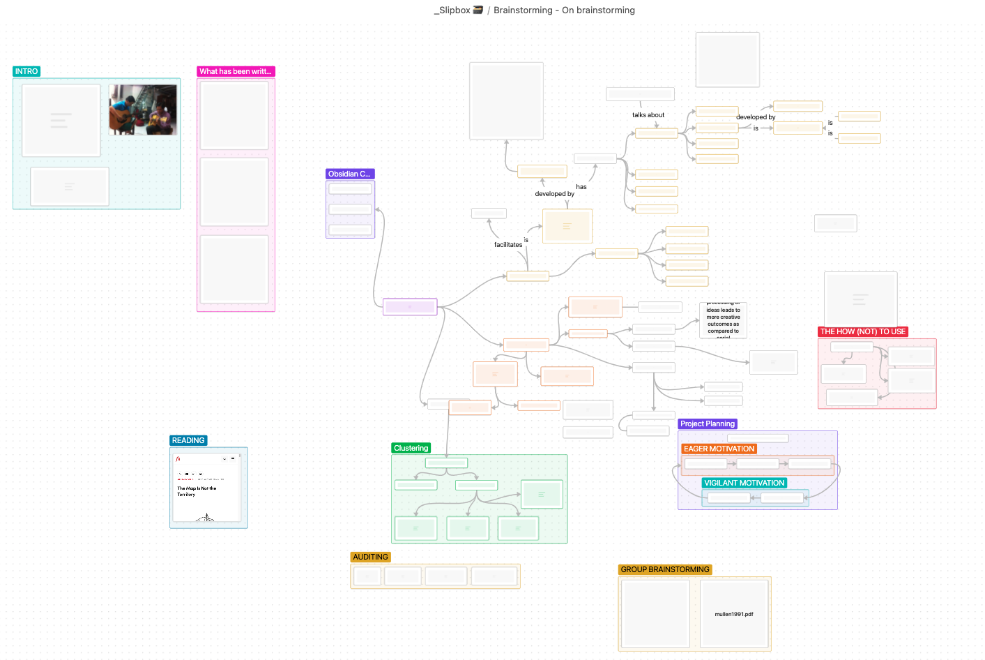 Đầu tiên, các ý tưởng về brainstorming được viết tự do trên file Canvas của Obsidian. Thông tin thể hiện dưới dạng ghi chép – note, thẻ – card, file ảnh, hoặc link trực tiếp đến website). Sau đó, những ý tưởng có liên quan với nhau được gom lại thành các nhóm (cluster) nằm gần nhau được liên kết với nhau bởi các mũi tên. Từ đây, dàn ý của bài viết về brainstorming dần hình thành. Các ý tưởng mới được thêm vào những chỗ khuyết trong dàn ý. Sau cùng, bài viết về brainstorming hình thành. Các ý tưởng chưa sử dụng trong bài viết này tiếp tục được phát triển và sử dụng cho các dự án khác.