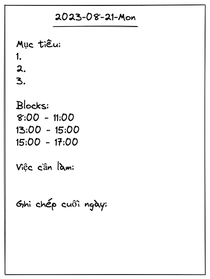 Tôi thường làm nhật ký này vào cuối tuần khi xem lại tuần rồi và lên kế hoạch cho tuần sau. Tôi cũng làm weekly check-in với team của tôi tại Đông Labs theo format này. Nhật ký này đơn giản nhưng cực kỳ hữu ích vì nó giúp bạn có kế hoạch hành động dựa vào dữ liệu thực tế. Nhật ký tuần có thể dài và chi tiết hoặc ngắn gọn súc tích tuỳ theo thời gian thực tế bạn có.