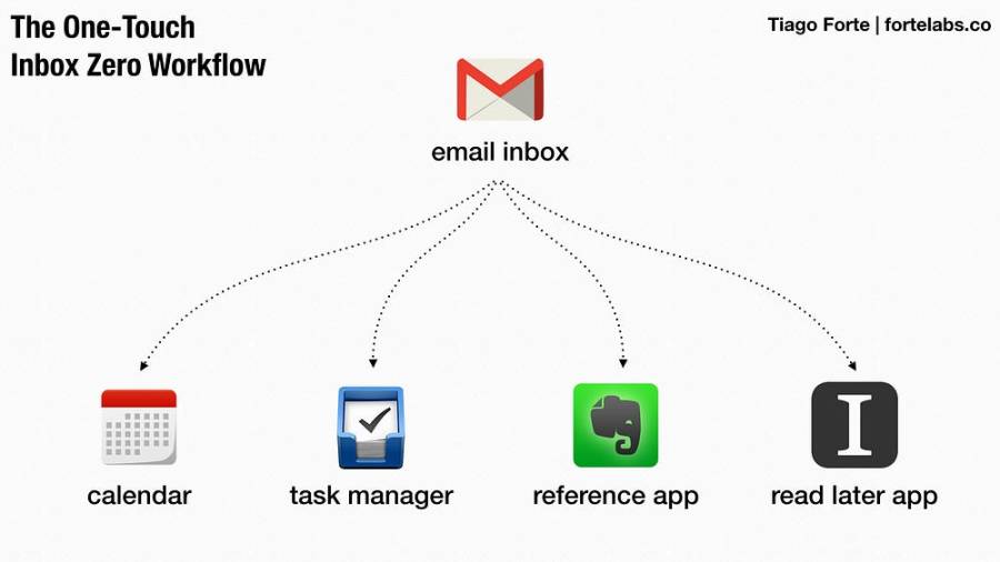 Khi mở một email bất kỳ trong Hộp Thư Đến, tôi sẽ đặt lần lượt bốn câu hỏi bên dưới. Ứng với mỗi câu hỏi sẽ có một phần mềm tương ứng để tôi lưu email (link đến email), tài liệu (pdf,…) hoặc link tài liệu (URL). Sau khi xử lý xong một email bằng cách phân luồng về một trong bốn thành phần bên dưới, tôi sẽ Archive email đó (phím tắt e) và xử lý email kế tiếp cho đến khi hộp thư đến không còn email nào.