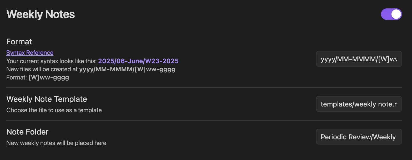 Sau khi cài đặt và enable plugin, bạn bật tính năng Weekly Notes, Monthly Notes, Quarterly Notes, và Yearly Notes lên. Tiếp đến, bạn có thể set up cho mỗi ghi chép này với các trường gồm: tên gọi và cấu trúc file lưu (format), biểu mẫu (template), và thư mục lưu trữ (folder).