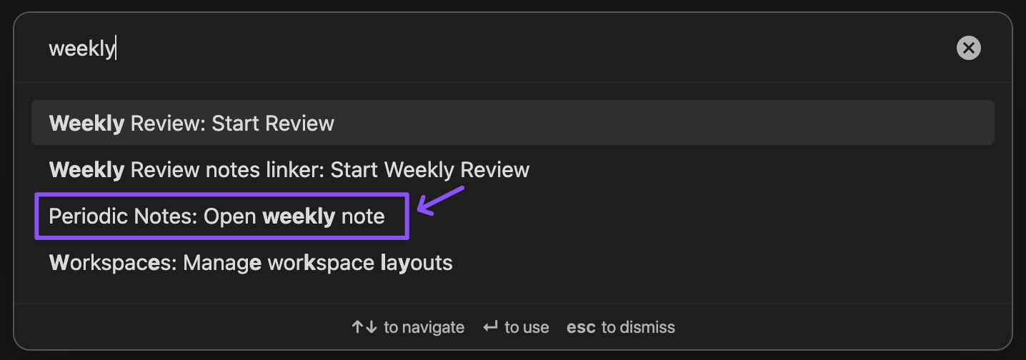 Để mở một ghi chú tuần, bạn nhấn Ctrl P (hoặc Cmd P) để vào khung Command palette rồi gõ “Weekly” và chọn “Periodic Note: Open weekly note” (hình dưới).
