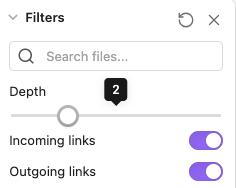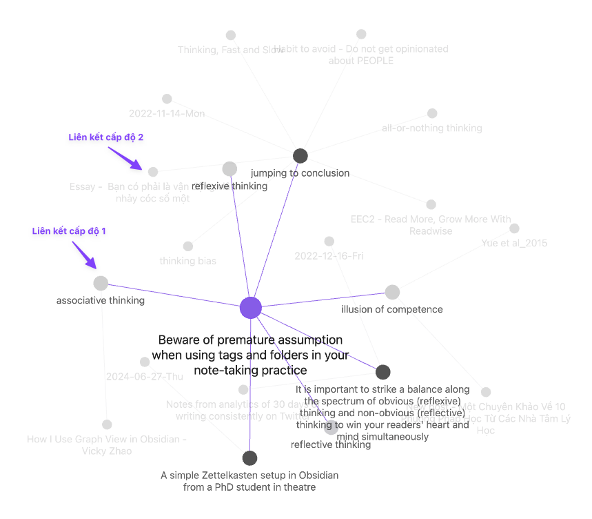 Local graph view có một tính năng rất hữu ích gọi là “depth level”. Nó cho phép bạn gia giảm độ dày của liên kết mà bạn muốn nhìn thấy. Ví dụ: Nếu bạn chọn depth level là 1, Obsidian sẽ cho bạn xem các ghi chép liên kết trực tiếp với ghi chép đang mở. Nếu bạn chọn depth level là 2, bạn sẽ thấy các ghi chép liên kết với các ghi chép có liên kết với ghi chép đang mở (hình dưới).