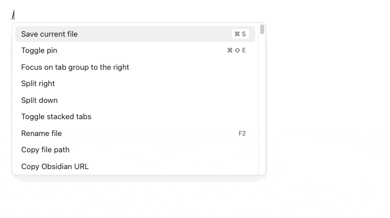Command palette: Mở bảng lệnh trong đó có các tính năng mà Obsidian có thể thực hiện cho bạn. Tuỳ vào số plugin mà bạn cài thêm vào, số command mà bạn có trong bảng lệnh này có thể lên đến hàng trăm. Cách khác là nhấn tổ hợp phím `Cmd P`.