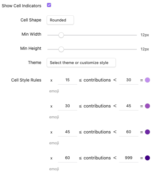 Phần Cell Style Rules là các quy định về thời gian tập và màu sắc thể hiện. Bạn có thể tự điều chỉnh các thông số và dùng bảng màu theo ý muốn để visualize mức độ thực hiện thói quen của bạn. Ví dụ: Màu càng đậm là số trang sách bạn đọc hoặc số từ bạn viết càng nhiều. Màu nhạt nhất thể hiện rằng bạn đã thực hiện phiên bản tối thiểu của thói quen, ví dụ như đọc 1 trang và viết 100 từ.