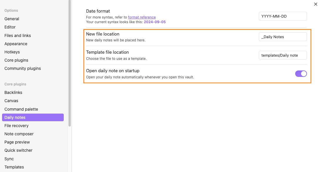 Cuối cùng, bật chế độ “open daily note on startup” để Obsidian tự động mở daily note khi bạn khởi động ứng dụng.