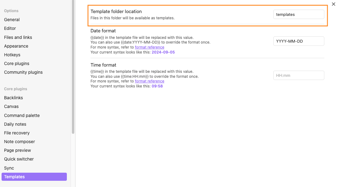 Sau đó, bạn mở phần Setting, trong danh mục Core plugins, chọn Templates plugin. Trong phần Template folder location, bạn gõ tên thư mục chứa các biểu mẫu đã tạo ở trên (templates). Phần Date format và Time format giữ nguyên.