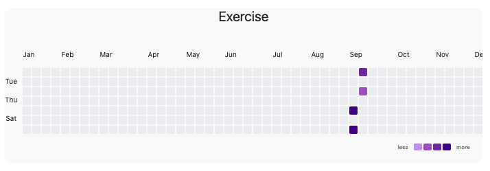 Vì vậy, trong bản tin hôm nay, mình sẽ chia sẻ với bạn cách tạo một habit tracker trong Obsidian đơn giản với một plugin có tên gọi là Contribution Graph. Sau khi đọc xong, bạn có thể làm được một cái tracker dạng heat map như hình dưới đây cho một thói quen bất kỳ.