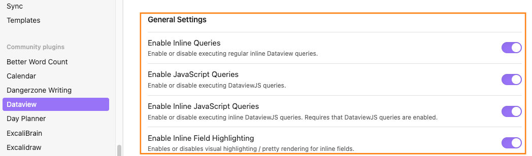 Update ngày 07.09.2024: Nếu bạn làm theo các bước trên mà không được thì bạn hãy vào Setting/Community Plugin/Browse, gõ tìm plugin Dataview, cài và enable lên, rồi vào Setting/Dataview plugin và bật cả bốn tuỳ chọn như bên dưới. Làm như vậy xong thì Contribution Graph sẽ đọc được dữ liệu từ daily note properties của bạn nhé. Sáng nay nhờ nói chuyện với chị mình mới phát hiện ra chỗ này.