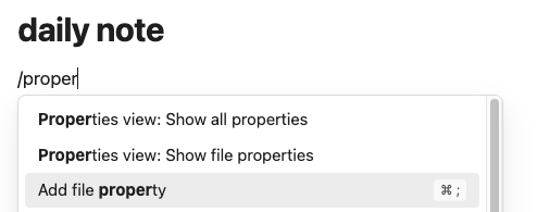 “Trong daily note, bạn gõ Slash command (dấu gạch /) và gõ chọn Add file property”. Chị gõ /property mà nó không ra gì cả. hay tại vì chị chưa cài plug in em list nhỉ?
