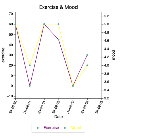 Ngoài ra, habit tracker sẽ cho bạn dữ liệu trực quan quý giá về chính bạn mà không có cuốn sách self-help hay khoá học tâm lý chữa lành, hay một life coach nào có thể làm được. Tôi gọi đó là năng lực tự nhận thức dựa vào dữ liệu (data-driven self-awareness). Ví dụ, bạn có thể trả lời câu hỏi như: Tập thể dục và tâm trạng có liên quan với nhau ra sao? với dữ liệu từ thói quen của chính bạn (hình dưới).