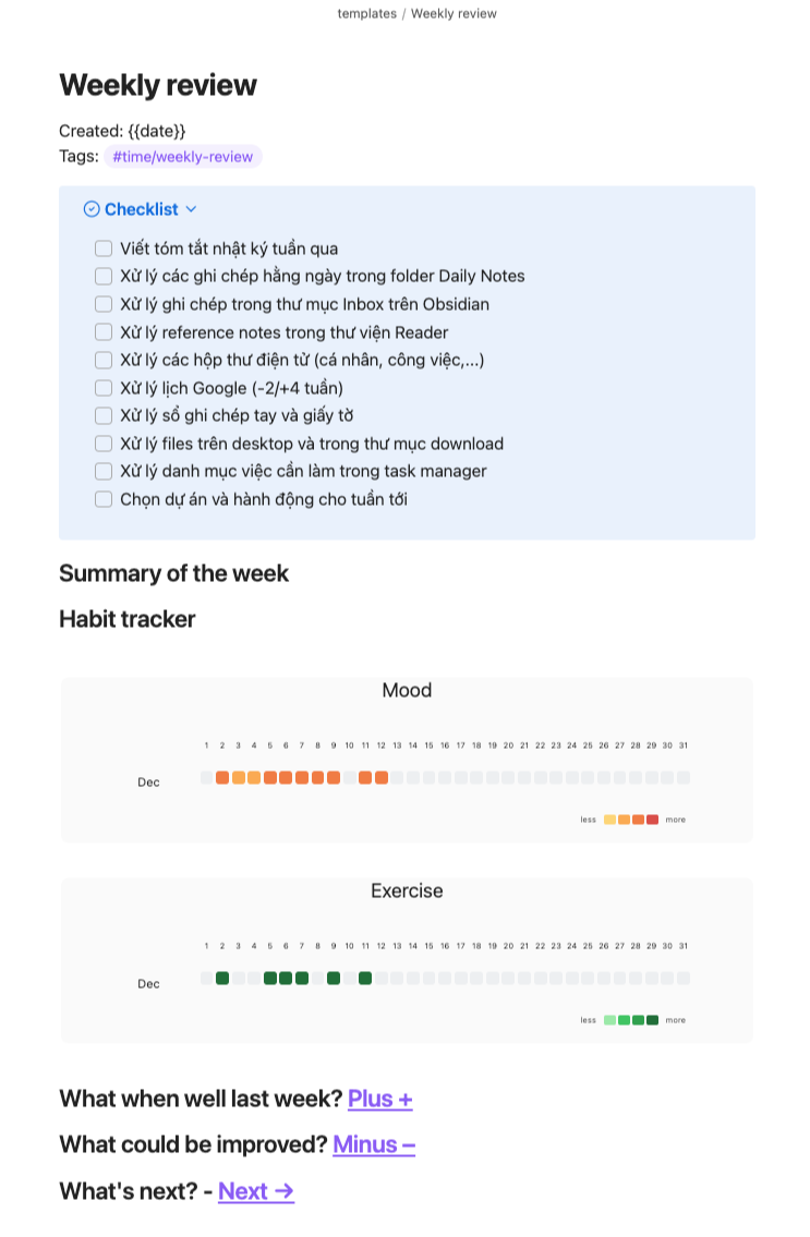 Mỗi tuần ít nhất một lần, thường vào sáng thứ sáu hoặc thứ bảy, tôi sẽ ngồi xuống rà soát lại tất cả các ứng dụng này và ghi chú lại những đầu việc cần làm hoặc tài liệu cần lưu trữ. Từ những data này, tôi viết một danh sách tất cả những việc mà tôi cần hoặc muốn làm trong tương lai dưới dạng gạch đầu dòng trong Obsidian.
